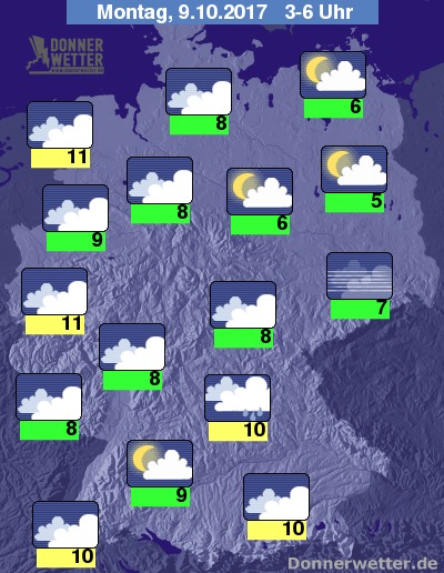 In der Nacht zum Montag kann es im Süden unter dichten Wolken hier und da etwas regnen, auch sonst bleibt es verbreitet stark bewölkt, jedoch weitgehend trocken. Meist nur locker bewölkt oder soagr sternenklar zeigt sich der Himmel von Sachsen bis zur Ostsee, hier bleibt es komplett trocken. Die Temperatur sinkt auf 11 Grad in Cuxhaven und bis 5 Grad im südlichen Brandenburg.