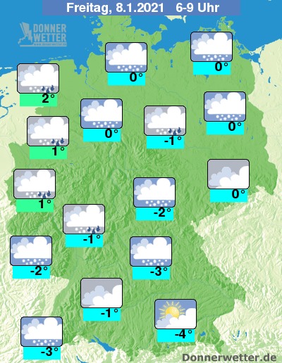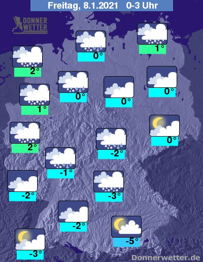 In der Nacht bleibt der Himmel über weiten Landesteilen bedeckt, gebietsweise Auflockerungen beschränken sich zunächst noch auf die südöstlichen Mittelgebirge, den Hochrhein sowie den Alpenrand. Im Norden, Westen sowie der Landesmitte muss in den kommenden Stunden immer wieder mit Regen-, Schneeregen oder Schneeschauern gerechnet werden, überwiegend trocken bleibt es südlich der Donau und entlang der Oder.