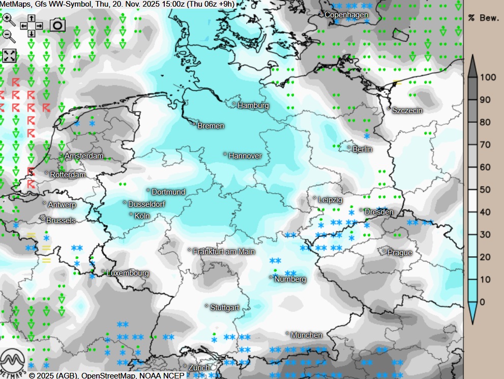 Am Donnerstagnachmittag zeigt sich der Himmel über dem Süd- und Nordosten sowie südlich der Donau stark bewölkt oder es ist bedeckt, dabei fällt zeitweise Regen, Schneeregen oder Schnee. Die Schneefallgrenze liegt bei 300 bis 500 m.