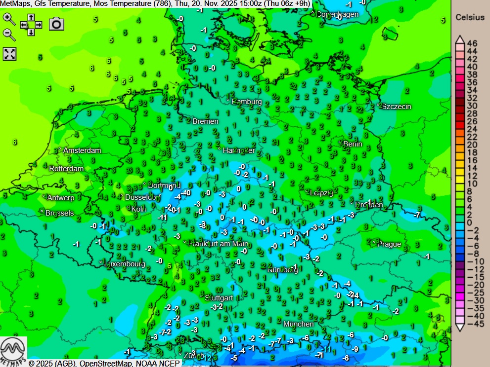 Die Wetter- und Temperaturkarte für Donnerstagnachmittag (15:00 Uhr) nach GFS:
