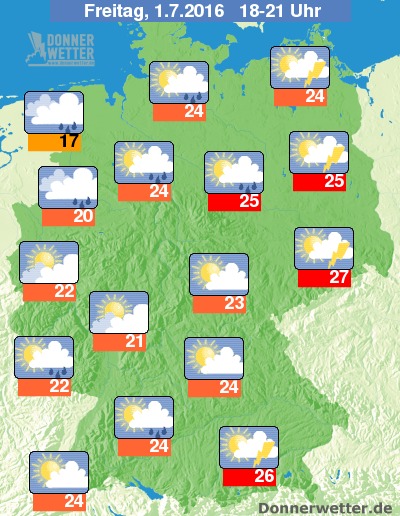 Am Freitagabend sind vor allem in der Nordhälfte phasenweise Schauer zu erwarten, entlang der Oder sind zudem Gewitter möglich. Sonne und Wolken gibt es dabei im Wechsel, nur zwischen Ostfries- und Münsterland zeigt sich der Himmel über weite Strecken bedeckt.