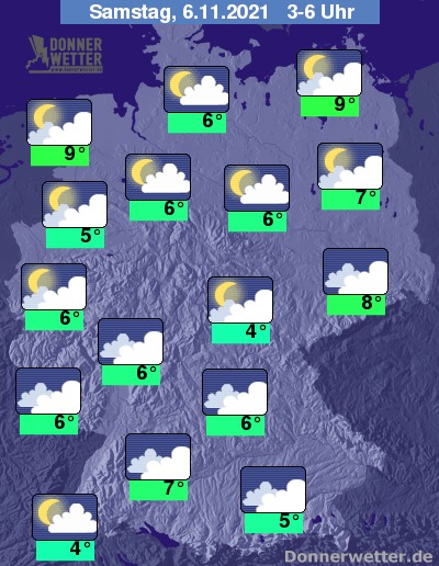 In der Nacht zum Samstag bleibt es vor allem über der Südhälfte der Republik meist trüb oder stark bewölkt, weiter nach Norden hin ist es hingegen vielerorts auch nur locker bis aufgelockert, teils aber auch stark bewölkt. Es bleibt weitgehend trocken bei Tiefstwerten von 9 Grad in Rostock und bis 4 Grad in Erfurt.
