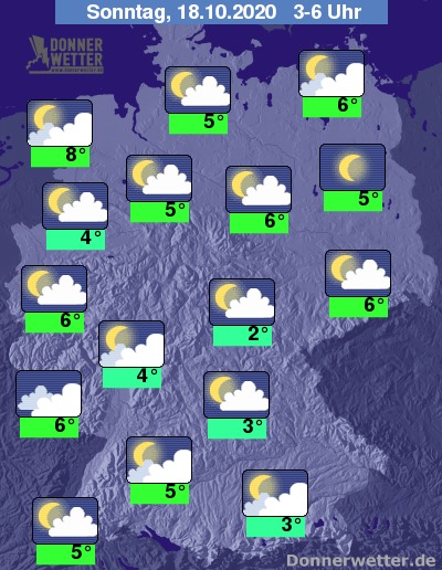 Heute Abend klingen auch im Osten die letzten Schauer rasch ab, es bleibt aber hier und auch im Süden oft stark bewölkt. Besonders im Norden und Westen ist es aber auch vielerorts aufgelockert und zum Teil nur locker bewölkt. Die Temperatur liegt bei etwa 8 Grad im Grabfeld und bis 12 Grad in der Kölner Bucht.