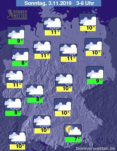 In der Nacht zum Sonntag ist es verbreitet stark bewölkt, dazu bleibt es von Bayern, über Sachsen bis ins östliche Brandenburg weitgehend trocken, im übrigen Land fällt jedoch zeitweise Regen. Die Temperatur sinkt auf 11 Grad in Magdeburg und bis 7 Grad in Rosenheim.