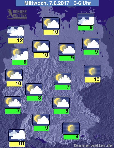In der Nacht zum Mittwoch klingen letzte Schauer entlang des Rheins sowie im äußeren Osten des Landes ab und die Bewölkung lockert hier wie schon im Rest der Republik auf, zum Teil wird es auch sternenklar. Direkt an der Nordsee sind einzelne Schauer und Gewitter möglich. Die Temperatur sinkt auf 12 Grad in Emden und bis 7 Grad im Grabfeld.