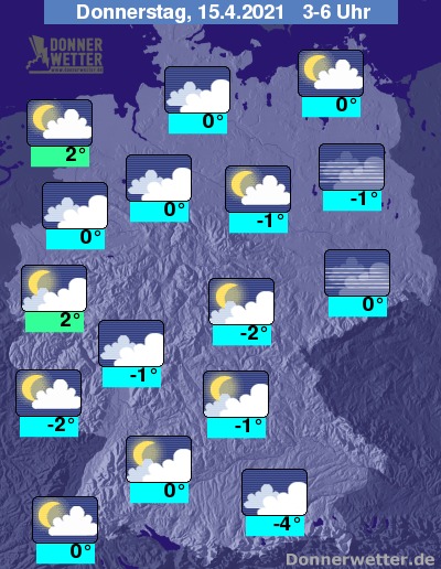 In der Nacht zum Donnerstag lockert die Bewölkung vielerorts auf, häufig ist es aber auch stark bewölkt, dazu bleibt es aber weitgehend trocken. Die Temperatur sinkt auf 2 Grad in der Kölner Bucht und etwa -4 Grad im Raum München.