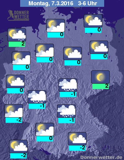 In der Nacht zum Montag ist es im Süden meist locker oder aufgelockert bewölkt und mehrheitlich trocken, vor allem in der Landesmitte fällt unter dichten Wolken jedoch gebietsweise Schnee oder Schneeregen, dabei besteht Glättegefahr! Im Osten und Nordosten ist es meist locker bewölkt, teils sternenklar und trocken. Im übrigen Bundesgebiet ziehen oft viele und teils dichte Wolken durch, dazu bleibt es aber meist trocken. Die Temperatur sinkt auf 2 Grad an der Nordsee und bis auf -2 Grad im Breisgau.
