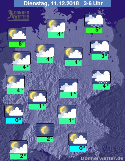 In der Nacht auf Dienstag zeigt sich der Himmel mal bedeckt, später auch häufig locker oder aufgelockert bewölkt. Mit Niederschlägen muss zunächst vor allem noch an der Nordseeküste und südlich der Donau gerechnet werden, im weiteren Verlauf regnet, schneeregnet oder schneit es hauptsächlich entlang der Oder.