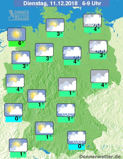 Am Dienstag bleibt der Himmel über der Osthälfte meist stark bewölkt oder bedeckt und zeitweise fällt Regen oder Schneeregen, in höheren Lagen auch Schnee. Die Westhälfte wird am Morgen von einem heiteren oder nur locker oder aufgelockerten Himmel bestimmt, Schauer sind meist nicht zu erwarten.