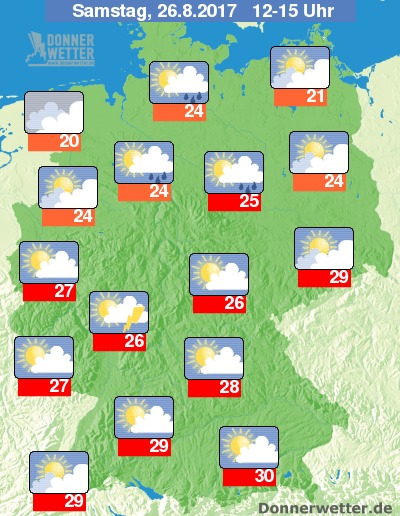 Heute Nachmittag ist es über dem Süden des Landes verbreitet heiter oder sonnig und trocken. Weiter nach Norden hin ziehen hingegen immer wieder auch dichte Wolken durch, die hier gebietsweise Schauer und auch örtliche Gewitter bringen. Dazwischen zeigen sich aber auch Aufheiterungen. Die Temperatur liegt bei etwa 20 Grad in Emden und 30 Grad in München.
