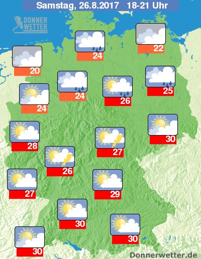 Heute Abend ist es im Süden überwiegend heiter oder sonnig und mit Ausnahme des Gebiets rund um den Schwarzwald, wo ein leichtes Gewitterrisiko herrscht, auch trocken. Im übrigen Bundesgebiet ist es häufig stark, sonst aufgelockert bewölkt, es können sich wiederholt Schauer und auch einzelne Gewitter entwickeln. Die Temperatur liegt bei etwa 20 Grad in Wilhelmshaven und rund 30 Grad in München.