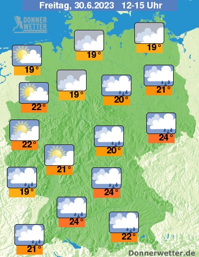 Heute Abend können sich über dem Süden und über Sachsen weitere Schauer, selten auch Gewitter bilden. Im übrigen Land kann sich die Sonne zwischen den Wolken immer wieder zeigen, oft bleibt es jedoch stark bewölkt, allerdings auch weitgehend trocken. Die Temperatur liegt bei 19 Grad in Erfurt und 24 Grad in Köln
