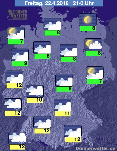 Heute Abend ist es im Küstenumfeld meist sternenklar oder nur locker bewölkt, an der niedersächsischen Nordseeküste auch stark bewölkt, jedoch trocken. Im Osten ist es meist aufgelockert bewölkt. Über der Südwesthälfte hält sich meist eine geschlossene Wolkendecke, dabei ist am Alpenrand und im Südwesten Regen möglich, sonst bleibt es trocken. Die Abendtemperatur liegt bei 13 Grad in Freiburg und etwa 7 Grad in Dresden.
