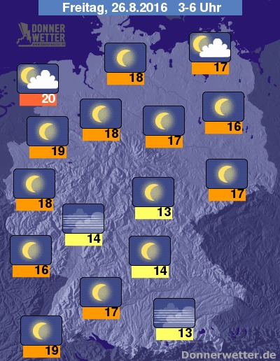 In der Nacht zum Freitag ziehen an Nord- und Ostsee gebietsweise lockere Wolken durch. Im großen Rest der Bundesrepublik präsentiert sich der Himmel jedoch sternenklar, dazu bleibt es landesweit trocken. Die Temperatur sinkt auf tropische 20 Grad am Dollart und bis etwa 13 Grad in der Oberpfalz.