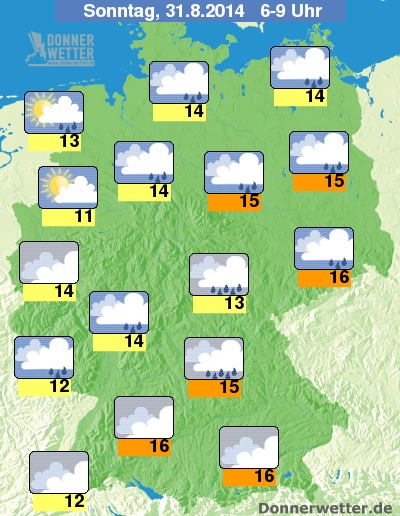 Am frühen Sonntagmorgen machen sich Niederschläge dann nicht nur mehr im Norden der Republik breit; auch im Süden Deutschlands kann es nun immer wieder schauern. Die Temperaturen liegen bei Werten um 15 bis 12 Grad.