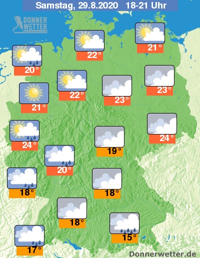 In den Abendstunden zeigt sich der Himmel entlang der Küsten sowie im Westen Deutschlands heiter oder es ist nur locker bewölkt. Es bleibt meist trocken, einzelne Schauer sind aber vor allem an der Nordseeküste nicht auszuschließen. Der Süden verweilt weiterhin unter einer überwiegend geschlossenen Wolkendecke, Schauer sind meist aber nur noch südlich der Donau zu erwarten.