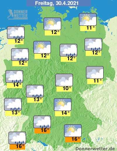 Am Freitag ist es aufgelockert bis stark bewölkt, über der Nordhälfte bilden sich einzelne Schauer, sonst bleiben Schauer eher selten. Die Temperatur erreicht 10 Grad im Eichsfeld und bis 16 Grad am Oberrhein.