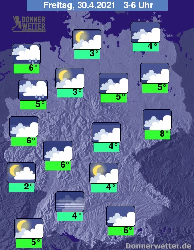 In der bevorstehenden Nacht lockert und klart der Himmel über dem Süden verbreitet auf. Weiter nach Norden hin ist es dagegen oft stark und hier und da aufgelockert bewölkt, dazu fällt im Nordwesten und auch in Ostseenähe gebietsweise Regen, sonst bleibt es weitgehend trocken. Die Temperatur sinkt auf 8 Grad in Dresden und bis 2 Grad in Saarbrücken.