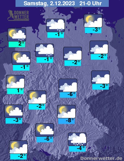 In der Nacht auf Sonntag zeigt sich der Himmel über der Nordosthälfte stark bewölkt, dabei sind einzelne Schneeschauer möglich. Im Westen und Südwesten ist es häufig aufgelockert bewölkt und es bleibt meist trocken.