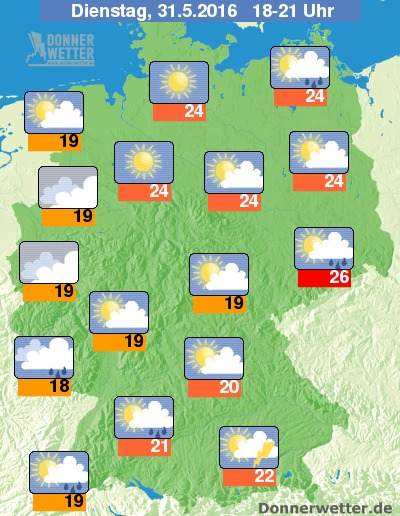Heute Nachmittag kann sich zwischen den teils dichten Wolken auch immer wieder mal die Sonne zeigen, jedoch bilden sich hier und da Schauer und besonders über dem Norden und Osten auch teils kräftige Gewitter. Die Temperatur liegt bei 18 Grad am Pfälzer Wald und um 26 Grad in der Lausitz.