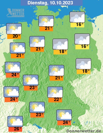Am Dienstag ist es im Norden und Osten wechselnd bis stark bewölkt. Im übrigen Land ist es meist heiter, teils ziehen auch einige Wolken durch. Es bleibt landesweit trocken bei Höchstwerten von 16 Grad in Vorpommern und bis 26 Grad im Breisgau.