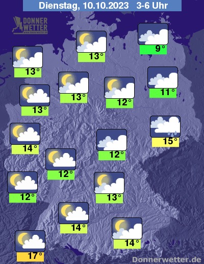 In der Nacht zum Dienstag ist es über der Südwesthälfte der Republik locker bis aufgelockert, teils auch stark bewölkt, aber trocken. Im Osten fällt unter dichten Wolken hier und da Regen. Im Norden ist es zwar stark bewölkt, aber meist trocken. Die Temperatur sinkt auf 17 Grad in Freiburg und etwa 9 Grad in Rostock.