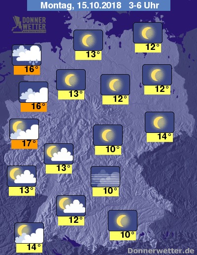 In der Nacht zum Montag ist der Himmel über der Osthälfte weitgehend sternenklar, weiter nach Westen hin nehmen die Wolkenanteile stetig zu und am Niederrhein und der Ems fällt gegen Morgen auch gebietsweise Regen, sonst bleibt es trocken. Die Temperatur sinkt auf 17 Grad in Köln und bis 10 Grad im Berchtesgadener Land.