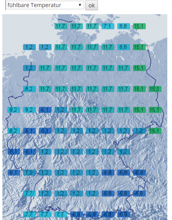 Am Nachmittag kriecht die Kälte nach Deutschland. Im Nowcasting sehen Sie die fühlbaren Temperaturen, die meist schon unter 0 Grad C liegen, auch im Flachland.
