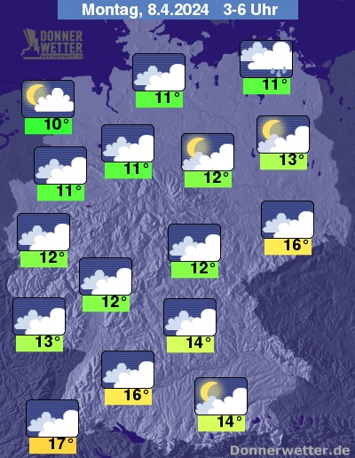In der Nacht zum Montag breiten sich viele und auch dichte Wolken auch in den Südosten des Landes aus. Regen fällt jedoch kaum. Im Umfeld von Nord- und Ostsee können kompakte Wolken jedoch gebietsweise Regen bringen. Die Temperatur sinkt auf 17 Grad im Breisgau und bis 10 Grad an der Nordsee.