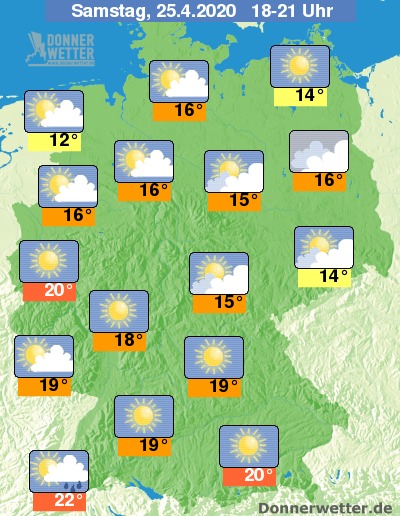 Heute Abend ist es im Land oft sonnig oder locker bewölkt, hier und da können aber auch mal einige und teils dichte Wolken durchziehen. Direkt am Alpenrand sind einzelne Schauer möglich, sonst bleibt es aber trocken. Die Temperatur liegt anfangs bei 12 Grad an der Nordsee und bis zu 22 Grad in Freiburg.