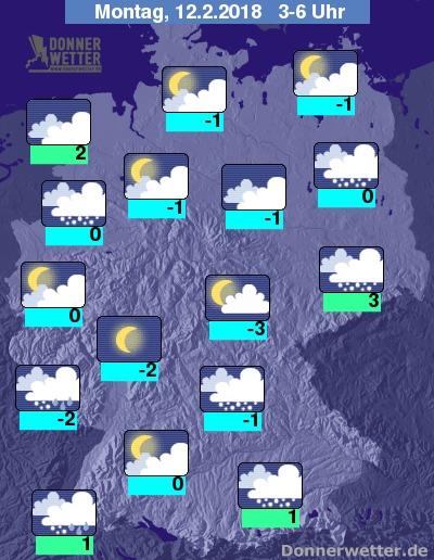 In der Nacht zum Montag ziehen oft dichte Wolken durch, die zeitweise Schnee oder Schneeregen bringen. In der zweiten Nachthälfte lockert der Himmel vor allem von der Landesmitte nach Westen und nach Norden hin auf, dazu bleibt es hier dann meist trocken. Die Temperatur sinkt auf 2 Grad an der Nordsee und bis -3 Grad im Eichsfeld.