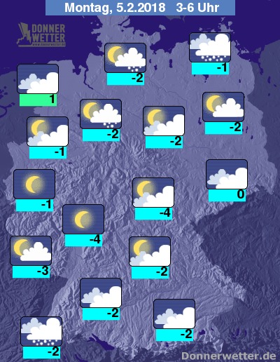 In der folgenden Nacht zeigt sich der Himmel häufig nur gering oder locker bewölkt, vor allem im Norden und im Alpenvorland halten sich jedoch auch verbreitet dichte Wolken, die hier auch Schneefälle bringen können, sonst ist es weitgehend trocken. Die Temperatur sinkt auf 0 bis -4 Grad.