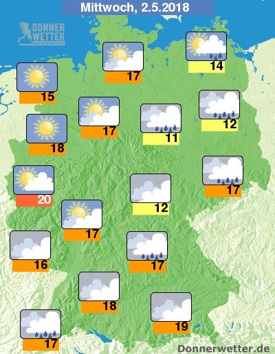 Am Mittwoch ist es über der Südosthälfte des Landes meist dicht bewölkt, dabei fällt gebietsweise Regen. Im Nordwesten scheint dagegen die Sonne von einem verbreitet wolkenlosen Himmel. Im übrigen Bundesgebiet ist es teils aufgelockert, teils stark bewölkt, jedoch trocken. Die Temperatur steigt auf nur 11 Grad in Magdeburg und bis 20 Grad in Köln.