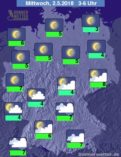In der Nacht zum Mittwoch zeigt sich der Himmel nördlich einer Linie vom Saarland bis nach Berlin weitgehend sternenklar. Im Süden bringen dichte Wolken hingegen hier und da etwas Regen, sonst ist es meist aufgelockert bewölkt und trocken. Die Temperatur sinkt auf 8 Grad in Dresden und bis 3 Grad in Rostock.