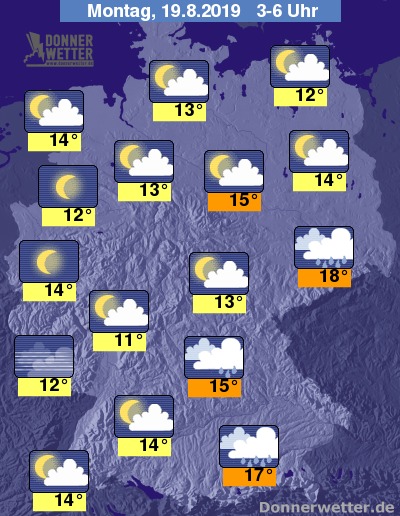 In der Nacht zum Montag fällt im Süden und über Sachsen noch oft kräftiger und gewittriger Regen, sonst ist es meist locker bewölkt und im Norden und Westen zunehmend sternenklar, dazu bleibt es trocken. Die Temperatur sinkt auf 18 Grad in der Lausitz und bis 11 Grad am Westerwald.