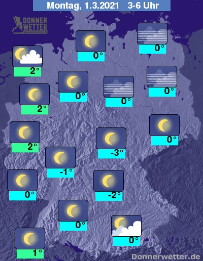 In der bevorstehenden Nacht ist der Himmel über dem Land verbreitet sternenklar, nur selten ziehen auch ein paar Wolken durch, dazu bleibt es trocken. Die Temperatur sinkt auf 2 Grad am Niederrhein und bis -3 Grad im Thüringer Becken.
