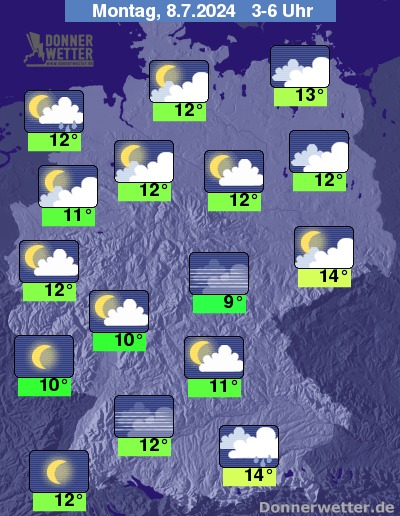 In der Nacht zum Montag klingt der Regen im Südosten langsam ab, an der Nordseeküste sind bei wechselnder bis starker Bewölkung zeitweise Schauer möglich. In den übrigen Landesteilen bleibt es bei größeren Wolkenlücken und gebietsweiser Nebelbildung weitgehend trocken.
