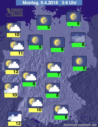 In der Nacht ziehen über der Südwesthälfte Deutschlands meist lockere Wolkenfelder hinweg, hier und da ist es auch mal stärker bewölkt, im Südwesten herrscht oft eine verschlossene Wolkendecke, dazu bleibt es trocken. Im übrigen Bundesgebiet ist es ebenfalls trocken und dazu sogar weitgehend sternenklar. Die Temperatur sinkt auf 12 Grad am Rhein und bis 7 Grad im Vogtland.