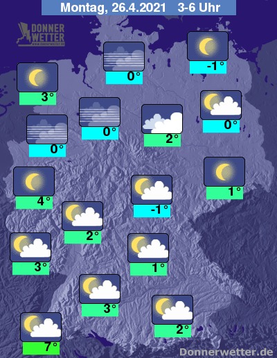 In der bevorstehenden Nacht ist es an den Alpen und gebietsweise im Osten oft stark bewölkt, ansonsten ist der Himmel über dem Land aber verbreitet sternenklar oder locker bewölkt. Es bleibt trocken bei Tiefstwerten von 7 Grad in Freiburg und um -1 Grad in Neubrandenburg.