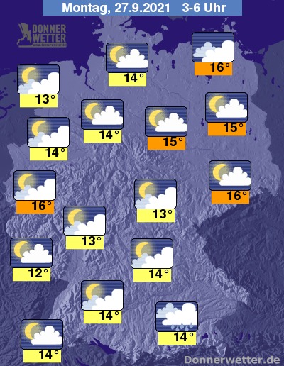 In der folgenden Nacht bilden sich vor allem im Süden anfangs noch vielerorts Schauer, hier und über der übrigen Südwesthälfte des Landes bleibt es die Nacht hindurch auch größtenteils stark bewölkt, jedoch kann es auch zeitweise etwas auflockern. Über dem Norden und Osten des Landes ist es ebenfalls teils stark, oft jedoch auch nur locker bewölkt, dazu bleibt es weitgehend trocken. Die Temperatur sinkt auf recht milde 16 Grad in Rostock und bis 12 Grad in Saarbrücken.
