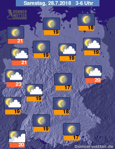In der Nacht zum Samstag ist der Himmel über dem Osten und westlich des Rheins teils wechselnd bewölkt, sonst ist es dagegen verbreitet sternenklar, dazu bleibt es trocken. Die Temperatur sinkt auf 23 Grad in Köln und bis 17 Grad im Grabfeld.