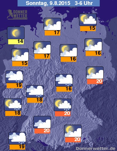 In der Nacht zum Sonntag ist es im Norden und Nordwesten oft schon locker bewölkt und im äußeren Nordwesten auch schon oft sternenklar und dazu trocken, sonst ist es zunächst verbreitet stark bewölkt und es kann immer wieder, teils gewittriger Regen fallen. Im weiteren Verlauf lockert die Bewölkung von Westen her mehr und mehr auf und es bleibt nachfolgend trocken. Die Temperatur sinkt auf etwa 20 Grad in München und bis etwa 14 Grad entlang der Ems.