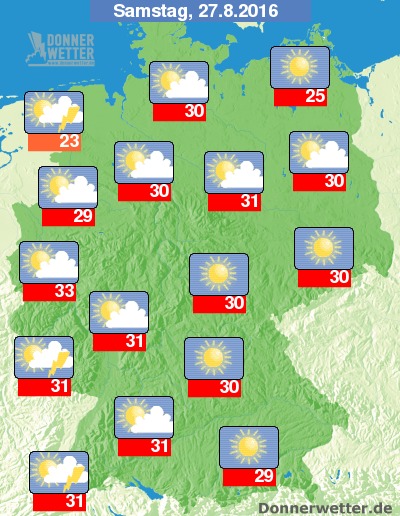 Am Samstag ist es besonders über der Südosthälfte Deutschlands sehr sonnig und dazu trocken. Weiter nach Nordwesten hin ist es meist heiter oder sonnig, hier und da können aber auch mal mehr Wolken durchziehen, dabei sind vor allem gegen Abend hier und da einzelne Schauer und Gewitter nicht auszuschließen, meist bleibt es aber trocken. Die Temperatur steigt auf 23 Grad in Ostfriesland und bis 33 Grad in Bonn.