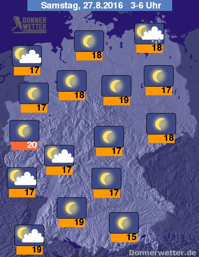 In der folgenden Nacht sind im Südwesten und im Umfeld von Nord- und Ostsee gebietsweise lockere Wolken unterwegs, dabei sind jedoch nur an der Ostsee einzelne Schauer und Gewitter möglich. Im übrigen Bundesgebiet zeigt sich der Himmel sternenklar, dazu bleibt es trocken. Die Temperatur sinkt auf tropische 20 Grad in Köln und bis etwa 15 Grad in München.
