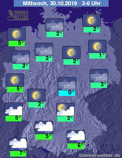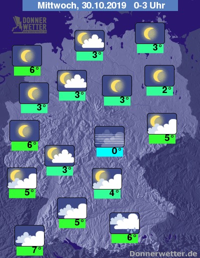 In der Nacht auf Mittwoch zeigt sich der Himmel über der Nordhälfte des Landes zunächst überwiegend sternenklar oder es ist nur locker bewölkt. Im weiteren Nachtverlauf kann sich verbreitet Nebel bilden. Südlich des Mains ist es teils bedeckt, teils aufgelockert bewölkt und vor allem in den frühen Morgenstunden mit zeitweise mit Schauern gerechnet werden.