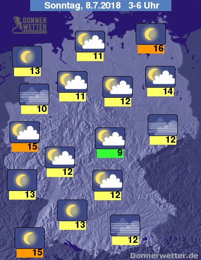 In der Nacht zum Sonntag ist der Himmel locker bewölkt oder sternenklar, dazu bleibt es trocken. Die Temperatur sinkt auf 16 Grad im Breisgau und bis 9 Grad im Eichsfeld.