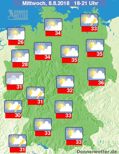 Heute Abend bilden sich entlang eines breiten Streifens vom Breisgau im Südwesten bis nach Vorpommern im Nordosten örtliche Schauer und Gewitter. Nordwestlich dieses Streifens ist es aufgelockert bis stark bewölkt und weitgehend trocken, südöstlich des Streifens dagegen heiter bis sonnig und trocken. Die Temperatur liegt bei 26 Grad in Wilhelmshaven und bis 36 Grad in Dresden.