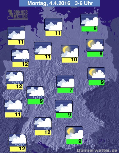 In der folgenden Nacht ist es nach Osten hin noch teils locker oder aufgelockert bewölkt. In den westlichen Landesteilen fällt bei weitgehend dichten Wolken gebietsweise Regen, der sich bis zum Morgen etwa auf die Westhälfte der Republik hin ausbreitet, sonst bleibt es dagegen weitgehend trocken, aber auch in der Osthälfte ist es zum Morgen oft stark bewölkt. Die Temperatur sinkt auf 12 Grad in Osnabrück und bis 7 Grad im Grabfeld.