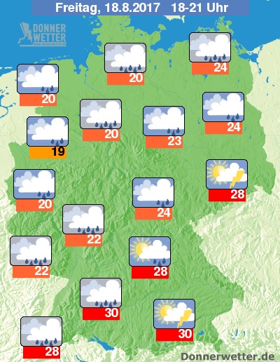 Heute Abend ist es über Sachsen und dem Südosten Deutschlands noch oft locker oder aufgelockert bewölkt und noch meist trocken, im großen Rest der Republik dominieren hingegen dichte Wolken den Himmel und es fällt immer wieder Regen oder es bilden sich einzelne Schauer und örtliche Gewitter. Die Temperatur liegt bei 19 Grad am Niederrhein und bis 30 Grad in München.