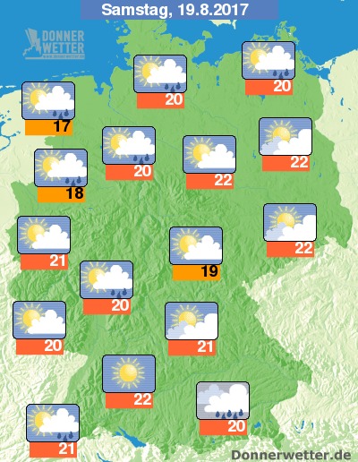Am Samstag zeigt sich wieder vielerorts die Sonne. Besonders zwischen Alpenrand und dem Bayerischen Wald bleibt es aber noch meist stark bewölkt und zeitweise regnerisch. Von Nordwesten ziehen im Tagesverlauf gebietsweise dichte Wolken mit einzelnen Schauern in die Nordwesthälfte des Landes, sonst bleibt es jedoch mehrheitlich trocken. Die Temperatur steigt auf kühle 17 Grad an der Nordsee und bis 22 Grad in Berlin.